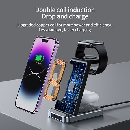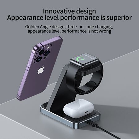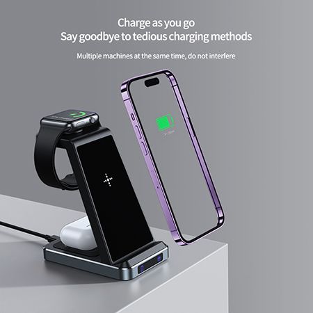 The3in1MultifunctionalWirelessChargeStandcombinesawirelesscharger,phonestand,andchargingcable,providinguserswithaconvenientchargingexperience.Whetherit’sasmartphone,earphones,orotherdevicescompatiblewithwirelesscharging,theycanbequicklychargedusingthisdock.Additionally,thedockalsofunctionsasaphonestand,allowinguserstopositiontheirphonesatanoptimalangleforwatchingvideos,makingvideocalls,andmore.