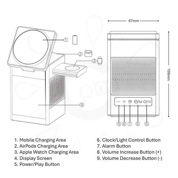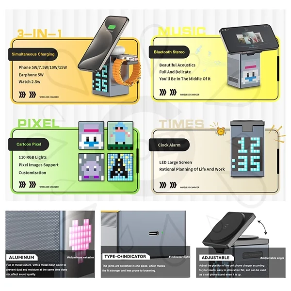 This 6-in-1 magnetic wireless charger with Bluetooth speaker and alarm clock not only offers practicality but also elevates space aesthetics with its modern design. It is suitable for corporate promotions, exhibition giveaways, or premium personal use, exemplifying the perfect blend of technology and style. For customization inquiries or further information, please contact GiftOne. We are committed to providing professional service and tailored solutions.