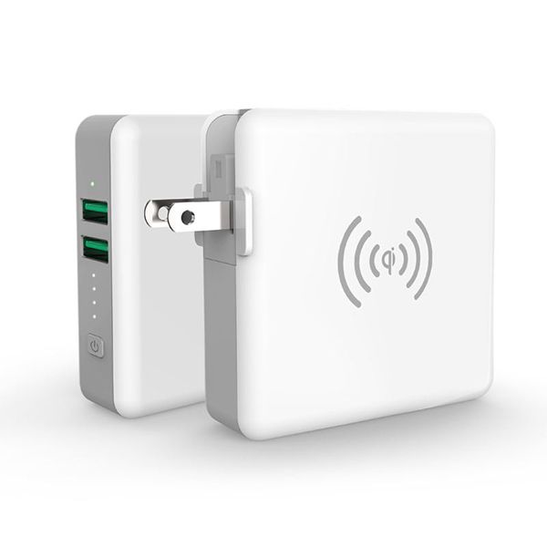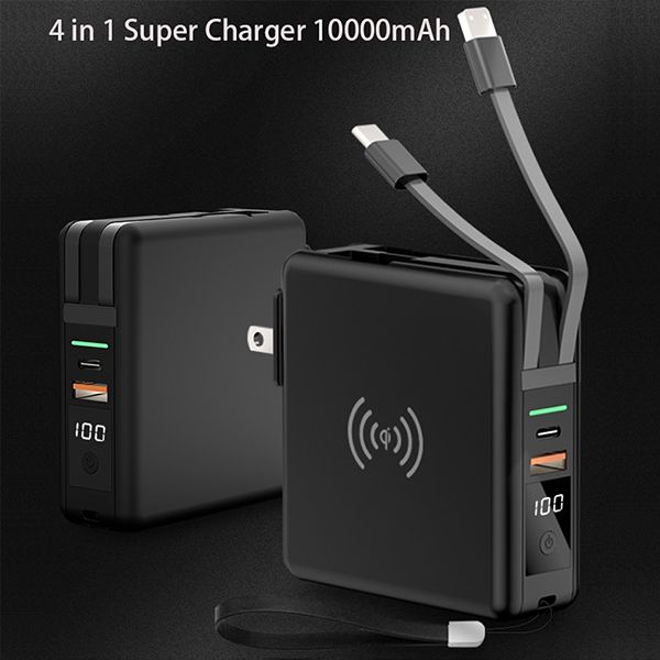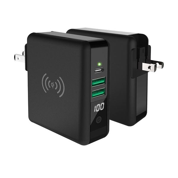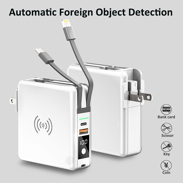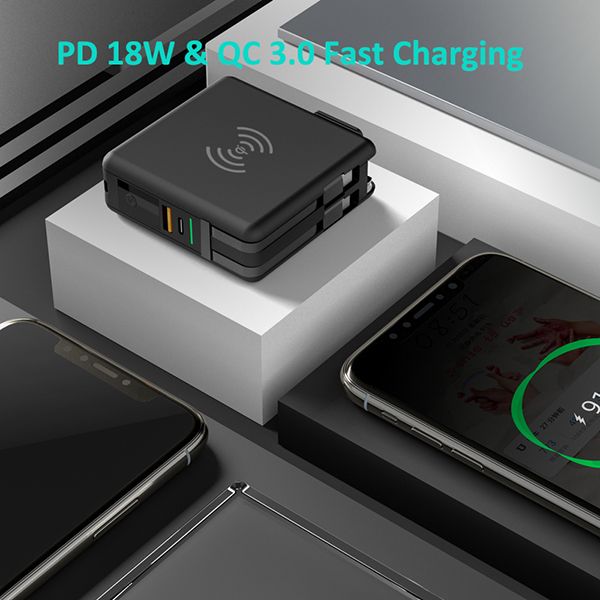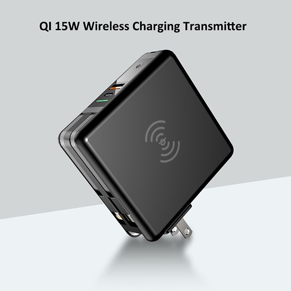 Features:1.DetachableACinputplugsforglobaloptionalUS,EU/KR,UKandAU2.Type-Cportforbothinputandoutput3.Built-incablesforiPhone,MicroandType-C.4.QI15WWirelessChargingTransmitter5.PD18W+QC3.0fastcharging6.Comeswit