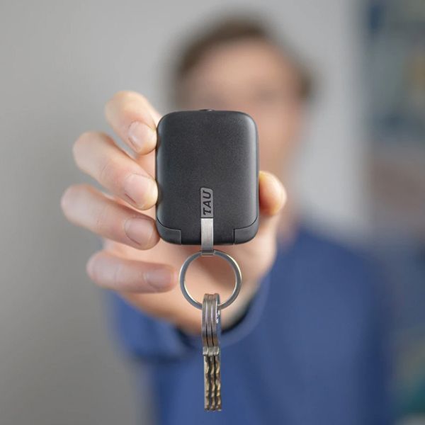 瑞士品牌TAU鑰匙扣行動電源的重量僅40克,長寬分別為6公分和4.5公分,尺寸比蘋果的AirPods充電盒還小,