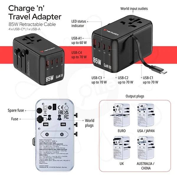 The Verbatim 85W Universal Travel Adapter with Retractable Cable is the perfect choice for enhancing travel convenience and promoting brand image. If you are interested in our Verbatim collection or customization services for promotional gifts, please feel free to contact GiftOne. We look forward to providing you with high-quality products and exceptional service!